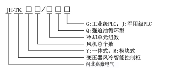 型号举例:JH-TK12/4QJ则为河北嘉豪电气有限责任公司生产的:军用PLC型12个风机4组冷却器强油循环一体式风冷智能控制柜